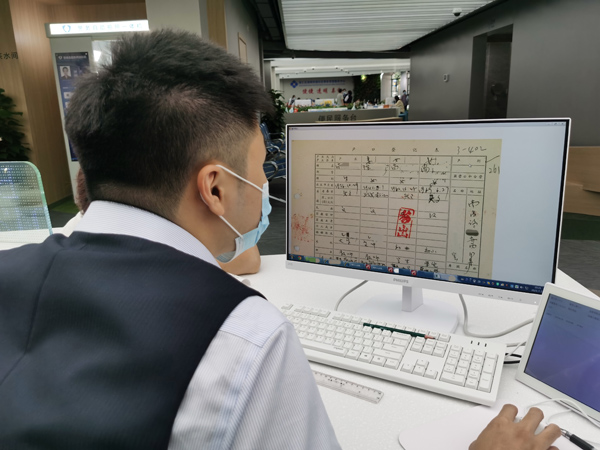 服務中心工作人員在平臺系統為居民查詢老舊紙質檔案