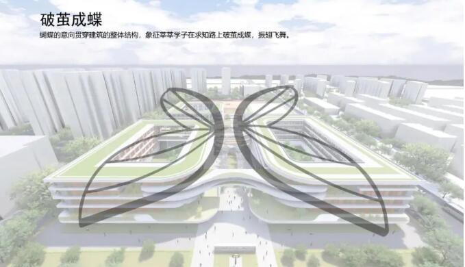 根據現階段方案成果,項目整體建筑形態以“蝴蝶”為意向,從西向東布局運動區、生活區和教學區。