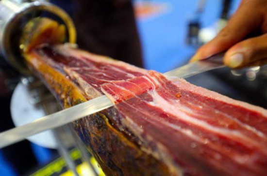 參展第三屆進博會的西班牙火腿。(張海峰 攝)