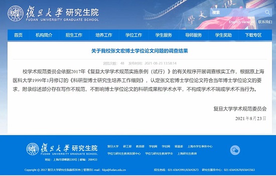 “校學術規范委員會依據2017年《復旦大學學術規范實施條例(試行)》的有關程序開展調查核實工作,根據原上海醫科大學1999年1月修訂的《科研型博士研究生培養工作細則》,認定張文宏博士學位論文符合當年博士學位論文的要求,附錄綜述部分存在寫作不規范,不影響博士學位論文的科研成果和學術水平,不構成學術不端或學術不當行為!