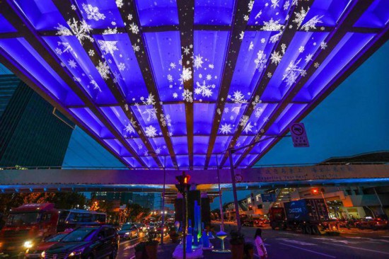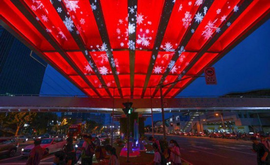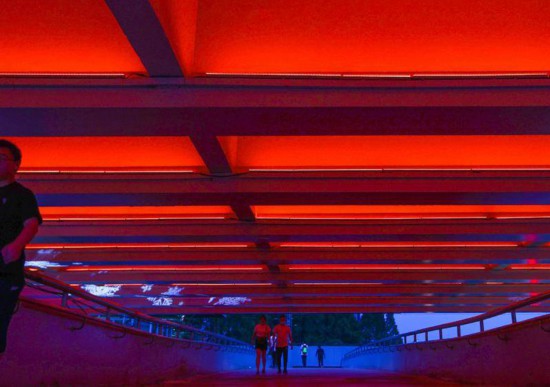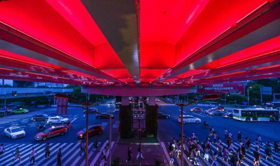 2021年8月23日,上海市民在高架下的彩色燈光下走過,色彩繽紛。近日,位于上海市寶山區同濟路、逸仙路高架道路混凝土箱梁的底部新安裝了LED燈帶,夜色里,燈帶連續變換色彩,美輪美奐。