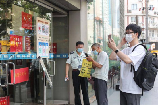 出示健康碼并測溫,沒有智能手機的讀者登記入場。