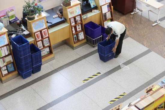 上海書城福州路店每天接待3000多名讀者,為提供安全的購書環境,書店加大防控力度,每天消殺頻次不少于3次,對讀者頻繁使用的購書車、籃,電梯扶手,坐椅等加強消毒,做好員工防護。
