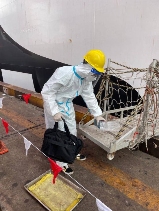 在船舶靠岸后,船舶代理人拿取經過全面消殺的出入境證件。