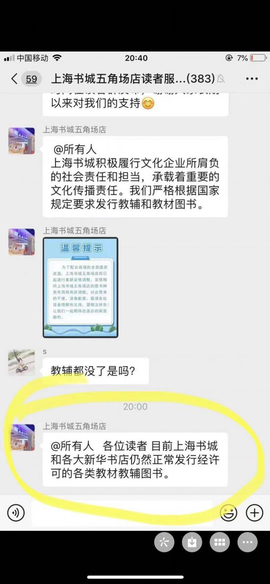 此外,微信聊天記錄圖片所示上海書城五角場店部分區域書架為空架,這是為了配合五角場萬達店的全面提升改造計劃,上海書城五角場店正在整體改造布局,裝修期間店內圖書種類布局將有所調整,并正按計劃對圖書布局調整歸置安排中,并非微信聊天記錄所述由于教輔圖書未通過審核而進行下架。