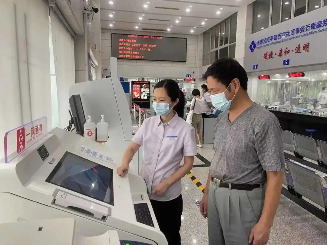 四平路街道社區事務受理服務中心大廳“一網通辦”的自助機上,可申請領取“離線碼”,還有導服員幫助老人操作。