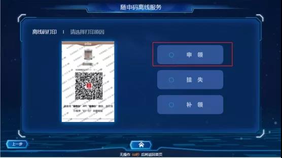 2、屏幕展示“離線碼”內容,確認無誤后,點擊“補領”,通過自助終端打印“離線碼”。