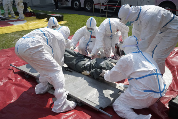 30分鐘的演練環環相扣,緊張卻有序!皞麊T處置完畢,在傷員活動區域進行全面消殺,醫療廢物集中收集并進行無害化處理!卑殡S著總指揮汪方的總結,演練正式進入尾聲,現場掌聲雷動。