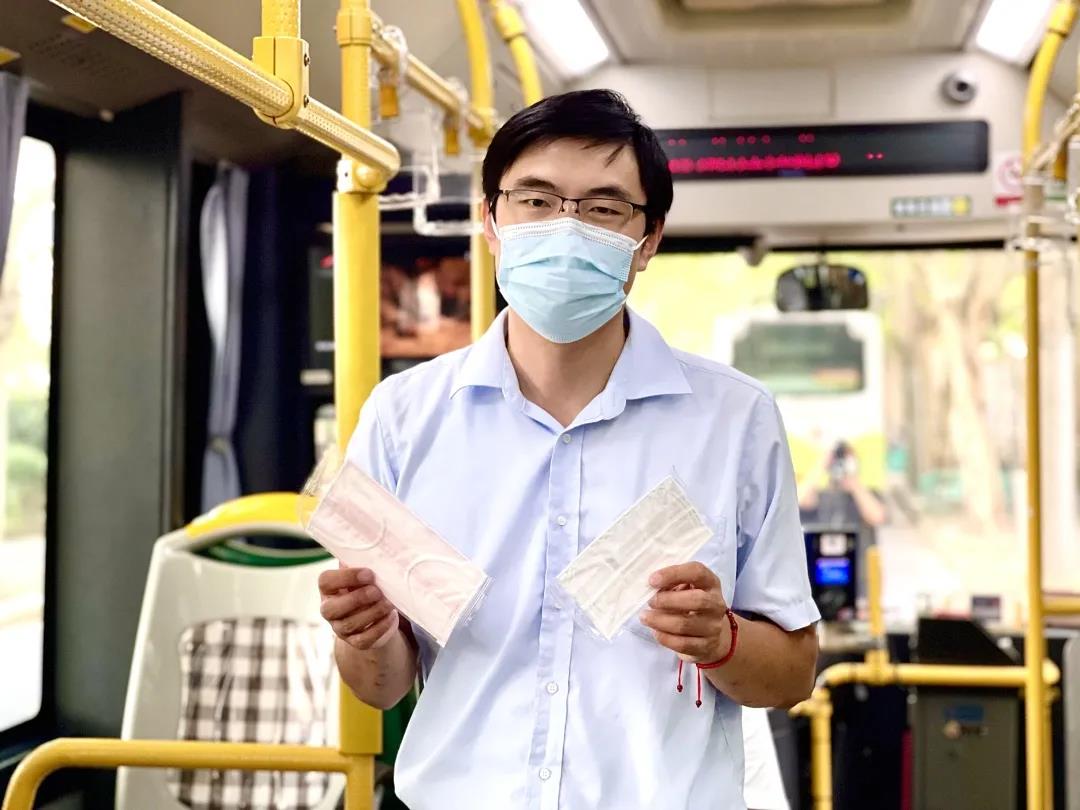 王栩鳴是6路學生專車的專職駕駛員,他為大家展示了車內的防疫物資配置。車廂前后,放置有消毒紙巾和免洗消毒洗手液,并儲存了一些口罩以備不時之需。在準備口罩時,王栩鳴特意選了大小不一的兩款口罩,而且都是獨立包裝。他說,學生專車也會有家長陪同上車,萬一有人沒戴口罩,那么不同型號的備用口罩就能派上用場。