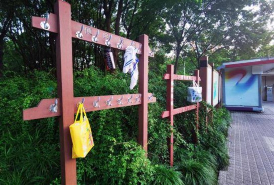 記者留意到,提供便民掛鉤的公園,效果也參差不齊。例如漕溪公園的“便民衣架”就更為簡陋:綠化叢中,偶爾可見黃色的木質圍欄,高不到1米,寬1.5米左右,正中間的桿子上用鐵絲掛著一個小吊牌,上面寫著幾個小字——“便民衣架,請勿攀爬”。站得稍遠些,便根本無法看出衣架的用途。