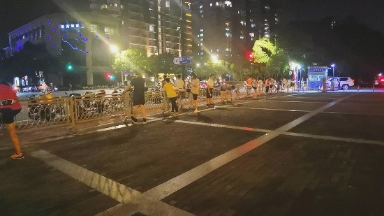 廣場外側一片面積不大的空地上,十幾個人排成一排,在欄桿旁壓腿拉伸,悉數濕透的衣服顯示,他們剛剛結束運動。欄桿外的人行道邊,有一條紅色健身步道,慢跑、快跑的人群正自東向西穿行而過,與廣場上密集的人群遙相呼應。天氣炎熱,大多數跑友衣著簡單,手機、毛巾拿在手里,個別人還掛著臂包、腰包等。“水杯去哪兒了?”“不方便拿,跑完再去買水喝!眲偱芡瓴降南呐空f。