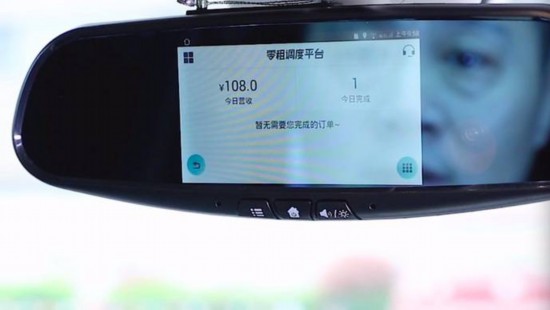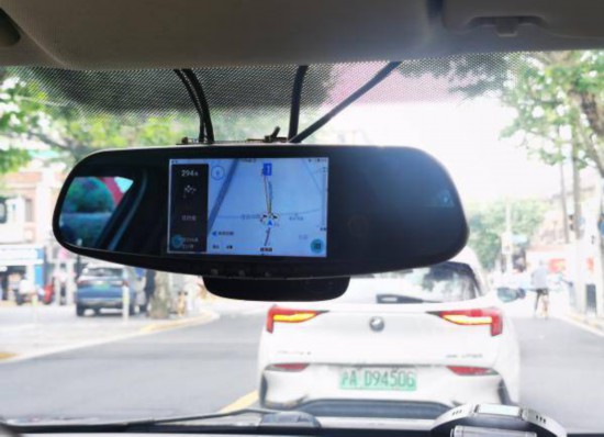 原本普通的后視鏡,被改裝成智能車載設備。鏡面中間部分為智能顯示屏,司機通過它就可以接單,根據乘客的定位,自動顯示導航。