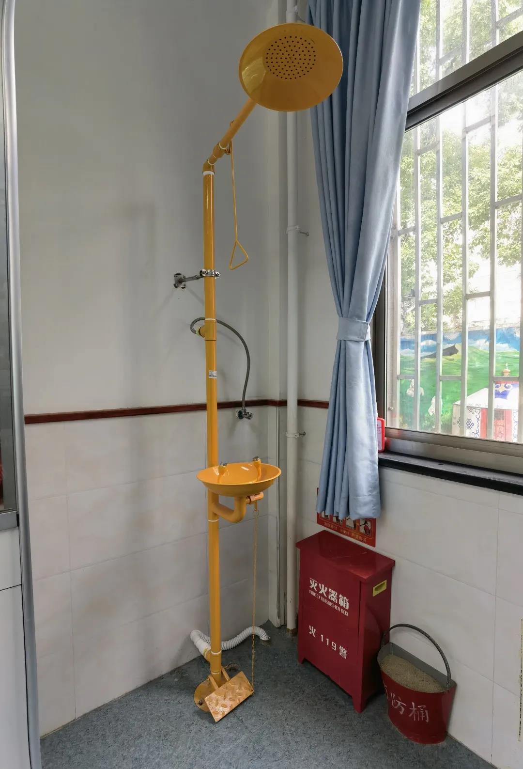在化學實驗室準備室內,配備了雙人雙鎖才能打開的毒品柜、提供標準通風系統的通風柜等,以保障人員安全;瘜W實驗室內也配備了應急沖淋裝置,該裝置能迅速減輕當化學液體、有毒物質濺到身體、臉和眼睛時,對人員的危害程度。