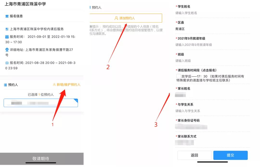 第四步:點擊“新增/維護預約人”并根據內容填寫家長和學生信息(所填信息須真實有效。。點擊“提交”,提交完成后您就能看到新增預約人信息。