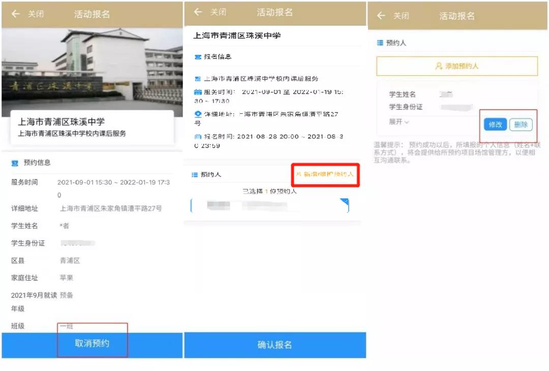 第六步:進入報名學校的首頁,點擊右上角“我的預約”就可以查看成功報名的信息,選擇要取消的信息,點擊“預約詳情”進入后點擊“取消預約”,然后重新選擇并進入需要報名的學校頁面,選擇要維護的預約人,就可以根據自己的需求進行“修改、刪除”,之后再重新報名即可!
