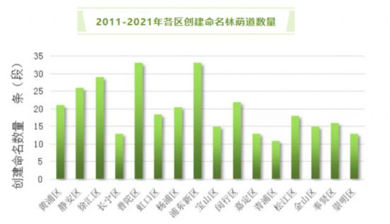 2020年:上海市綠化部門完成了林蔭道兩個五年規劃任務,全市共創建命名林蔭道264條,總長度超過258公里,形成10個林蔭片區。
