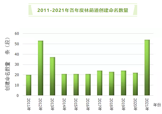 2021年:新命名林蔭道54條(段),其中新增2條苦楝林蔭道,2條重陽木林蔭道,1條榔榆林蔭道,至此林蔭道涵蓋樹種達18種,包括懸鈴木、香樟、欒樹、水杉、櫸樹、無患子、珊瑚樸、金絲柳、臭椿、銀杏、樸樹、廣玉蘭、烏桕、中山杉、日本晚櫻、重陽木、苦楝、榔榆。