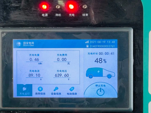 充電工在對車輛進行登記后,穿好防靜電服,戴好防靜電手套,插上充電槍,對應的充電樁顯示屏上,顯示了這輛公交車的充電電量、充電費用、充電電流及充電電壓等。