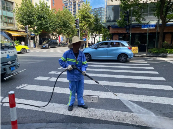 據了解,為應對高溫天氣,楊浦環發公司靈活調整作業時間和工作機制,采用“做兩頭,歇中間”的作業模式。工作時大家分散在街道的各個角落,黃色掃地機、高壓水槍一起上陣,效率非常高。