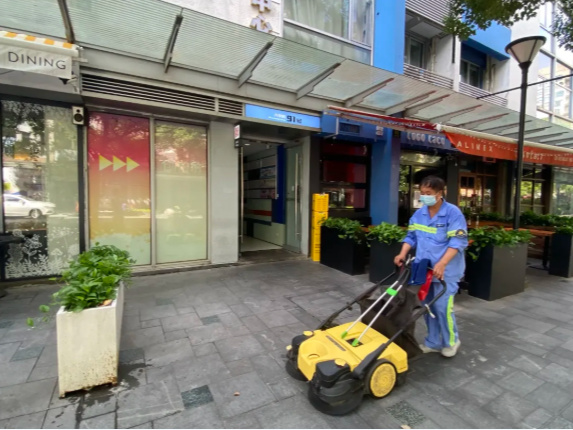 大學路是五角場區域很有名氣的街區,海杰保潔分公司清道班考核員丁業告訴記者:“普通的清掃工人會對整個道路進行普掃,由于大學路綠化比較多,落葉掉下后普掃人員掃不過來,我們便安排了掃地車來清掃。此外,大學路晚上比較熱鬧,部分地方有油污,我們便安排沖洗車,對整條大學路進行沖洗!