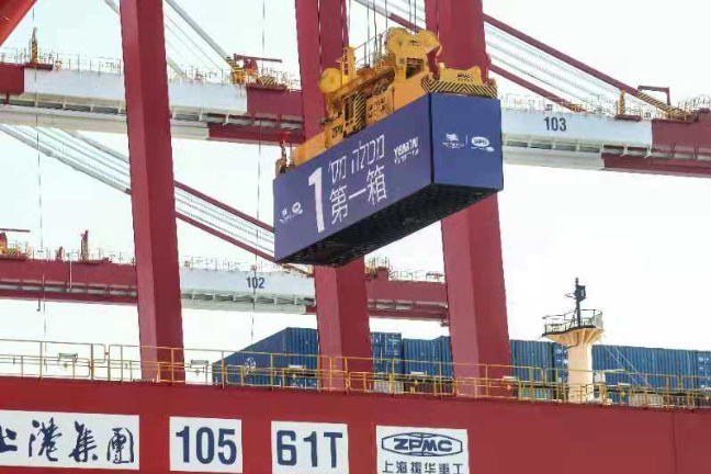 海法新港開港第一箱貨物通過遠程操作起吊。