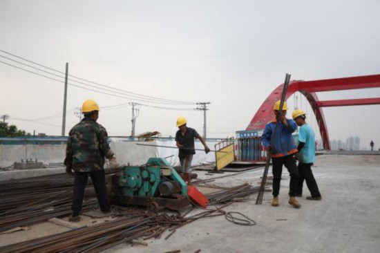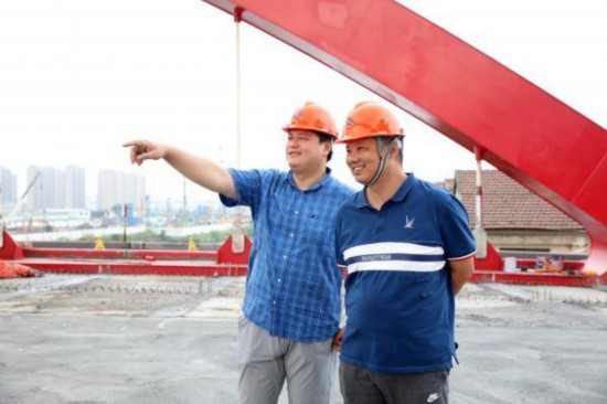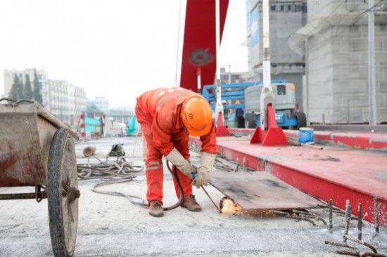 “這個施工工藝在山區公路項目中運用得比較成熟,但在城市橋梁建設當中還相當少見!笔┕し缴虾J薪ㄔO工程管理有限公司項目經理張俊杰介紹,整個鋼箱式橋梁重達1500噸,前期拼裝就花費7個月,如今橋梁頂推平穩完成,正在進行橋梁路面施工。