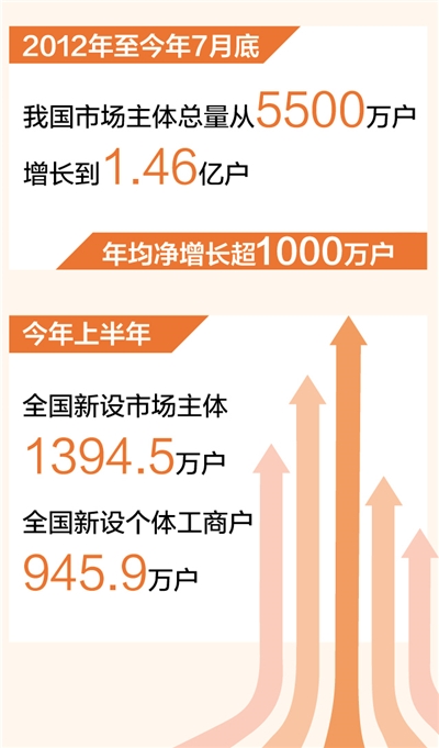 我國商事制度改革取得積極成效。國家市場監督管理總局9月6日公布,我國市場主體總量從2012年5500萬戶增長到今年7月底的1.46億戶,年均凈增長超1000萬戶,市場主體活躍度總體穩定在70%左右。蓬勃發展的市場主體,促進我國超大規模市場的形成和發展,成為穩住經濟基本盤和穩定就業的中堅力量。