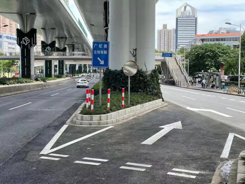 經過市區有關部門現場反復踏勘論證,在幾易其稿的基礎上,最終形成解決方案:克服高架橋柱不能移動,可操作空間小,現場交通不能中斷等一系列困難,決定將原道路西向東進口方向進行調整,原廣紀路左轉車道調整至輔路,調整后車輛由汶水東路主路匯入輔路左轉進入廣紀路。同時,為了方便司機提早變道,在路口還增設了相應道路指示引導標牌,力爭做到標識明確,指引清晰。