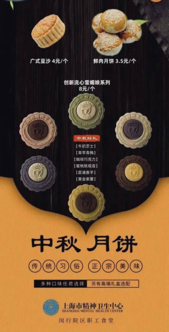 宛平南路600號,即上海市精神衛生中心徐匯院區的所在地。在今年中秋節來臨之際,該院閔行院區職工食堂針對兩個院區的員工推出了定制月餅禮盒,總共6個口味,涵蓋了牛奶芝士、青蘋青梅、咖啡巧克力、蜜桃鐵觀音、荔浦香芋、黃金紫薯。