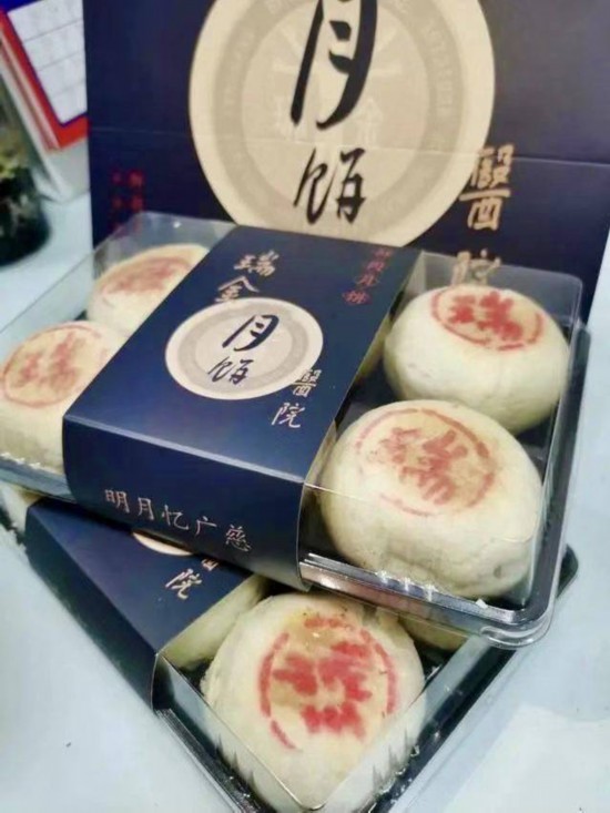院士“真跡”也被運用到了月餅上。今年瑞金醫院鮮肉月餅上的紅印“瑞”字取的正是瑞金醫院的“最新官方字體”,由中國最高科技獎獲得者、我國血液學名家、中國工程院院士王振義撰寫。王振義院士今年已97歲高齡,他的墨寶“瑞”字被印上月餅,配以“明月憶廣慈,天涯共瑞金”的典雅包裝,成為醫院界月餅的“氣質擔當”。