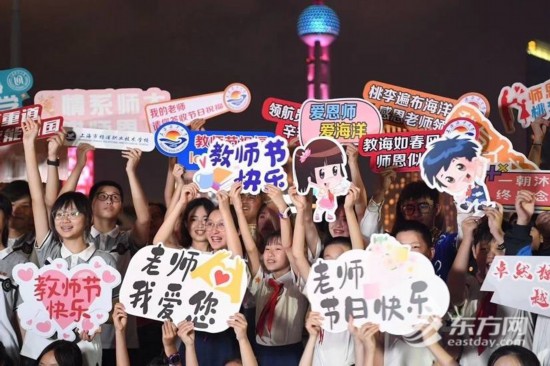 9日晚,來自東華大學、上海師范大學、上海海洋大學、華東師范大學第二附屬中學、上海市楊浦職業技術學校、上海市黃浦區盧灣一中心小學等大中小學校的40余名師生、家長代表來到外灘,以集體喊話送祝福、錄制微視頻、拍攝創意照片等方式感念師恩、禮敬教師。東華大學師生代表結合校慶70周年,錄制“七秩東華,師恩難忘”微視頻,向全市教師送上誠摯祝福;上海師范大學本科師范生、研究生支教團代表編排手勢舞《聽我說謝謝你》表達對師長的祝福,以青春之我擔師道之責;上海海洋大學學生在外灘“偶遇”,喊話“愛恩師、愛海洋”;華東師范大學第二附屬中學學生代表演繹外灘街舞快閃,以青春活力致敬恩師;顒游送鉃┢脚_上的游客們紛紛駐足觀看,并以此為背景為老師錄制祝福視頻。