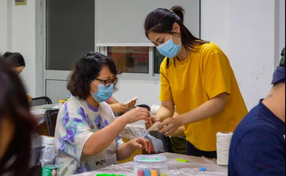 夜色已至,夏暑未消,從公司、從家中趕來的學員,戴好口罩、測量體溫、同查雙碼,踏入燈火通明的浦南文化館。36名學員分別走進了上海市民藝術夜校的拇指琴與扎染課堂。一間教室內,傳出了拇指敲擊琴鍵的叮叮咚咚;另一間教室內,舉目所及則是蔚藍一片。