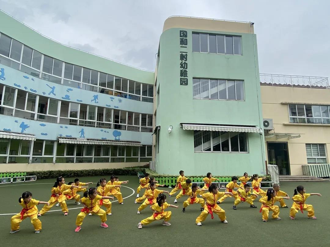 踢腿出拳、轉身下蹲......下午兩點半,在國和二村幼稚園的操場上,一群身穿黃色練功服的小朋友們正在認真地跟老師學習中華武術。