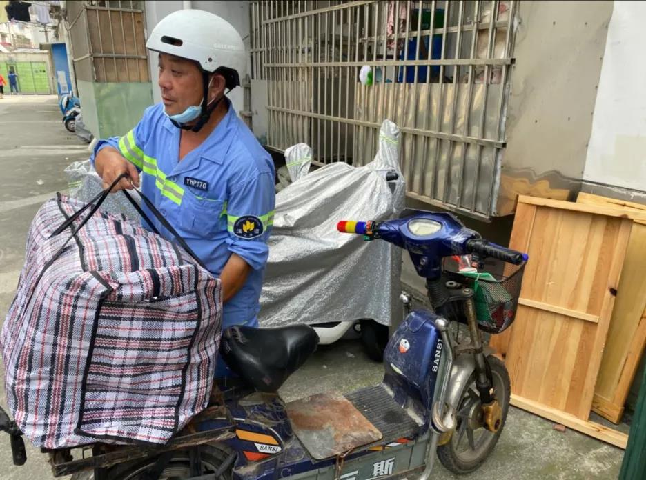 黃道廣夫婦的老家在河南駐馬店,2016年他們來到上海務工。每天,黃道廣帶著手推車巡視街面衛生,妻子則負責清掃街面。這次搬家,老黃本打算狠狠心,處理一些舊衣服,可妻子秦迎春還是念叨著太浪費了,“東西我一般很少扔的,能用盡量用,因為兒子女兒在上學,正是需要用錢的時候!