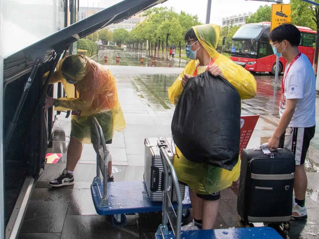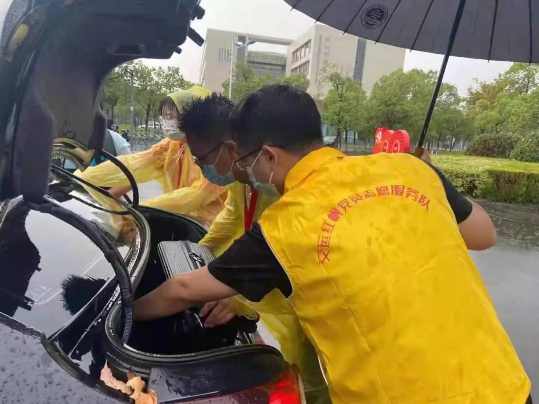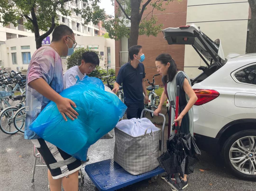 上海海事大學校園大,從校門口到宿舍,開車需要十分鐘車程。風雨中,13輛掛著“新生義務服務車”標識的擺渡車在校園里來回穿梭,來自海大文印中心、家佳物業、愛心書屋等單位的志愿者,聯手幫助返校學生將行李物品運至宿舍。不少學院的黨員教師也主動提出“私車公用”,免費為學生擺渡搬運行李。