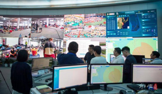 臨港新片區應急指揮中心內,工作人員正在處理轄區內的事務。