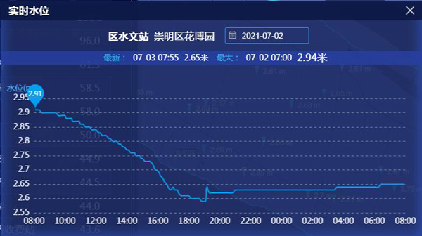 “暴雨來襲,我們通過查看防汛監測GIS圖上的各種關鍵數據指標,如園區實時雨量、水位高度、視頻監控等情況,實時掌握汛情動態!背缑鲄^防汛部門相關技術負責人顧偉介紹,7月2日早上7時許,花博園區雨量較大,查看園區內水位為2.87米,并且有升高趨勢。