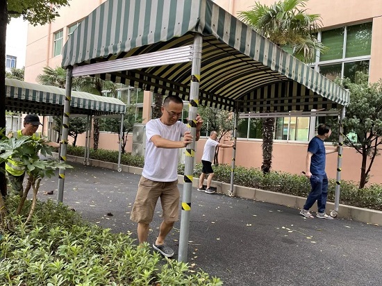 為確保安全,中原幼稚園將園內的移動雨棚全部推至空曠的操場,并用繩子進行了捆扎。