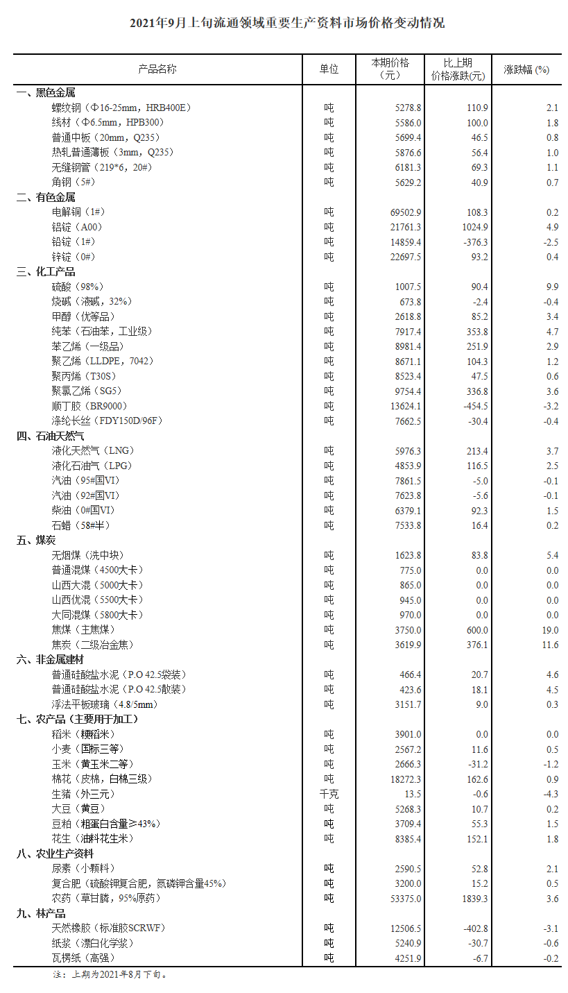 國家統計局:9月上旬重要生產資料價格34種漲11種降 焦煤漲19%生豬降4.3%