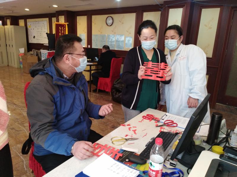 除了派駐公務員,楓林街道在細節上彰顯情懷。新春佳節期間,非遺項目“楓林剪紙”區級傳承人鮑立峰來到新惠隔離點,發揮特長舉辦了新春剪紙活動,為醫護人員和隔離人員剪了幾十個福字、窗花,送上新春祝福。疫情防控期間,鮑立峰聯合街道文化館通過線上教學、線下展覽等方式,以“上海剪紙”為載體,刻畫、展示了無數上?挂叩臏嘏查g,“當醫護人員從我手中接過‘!,疲憊的臉上露出溫暖笑容時,我意識到,‘上海剪紙’走進隔離點,有著特殊的意義!