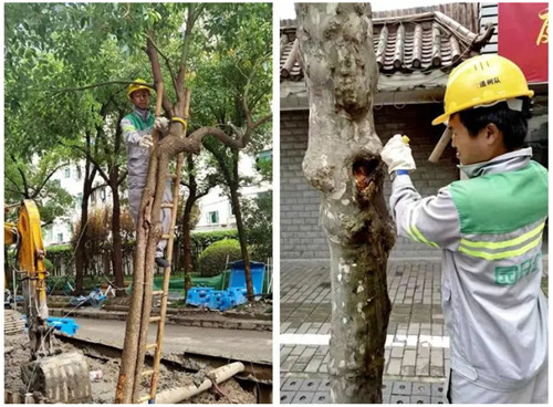 行道樹養護,看似是修修剪剪的事情,其實這是一個既危險又辛苦的崗位。由于養護季節特點和工作需要,夏天,養護工需要穿著厚衣服上樹剝芽;隆冬,為靈活上樹修剪則要少穿;遇到臺風冰雪等惡劣天氣,行道樹養護隊總是要第一時間趕到現場排險。即使白天的修剪工作緊張忙碌,但只要接到訴求,無論多晚,隊員們也會立即放棄休息前往處理突發事件,干凈利落,一步到位,工完場清。