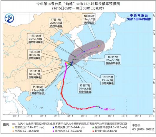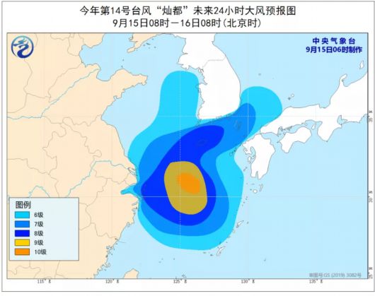 預計,“燦都”將于15日白天至夜間在東海北部海域回旋,強度變化不大,16日開始轉向東北方向移動,將穿過朝鮮海峽向日本北部沿?拷,強度逐漸減弱。