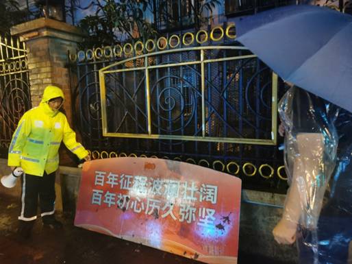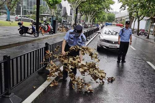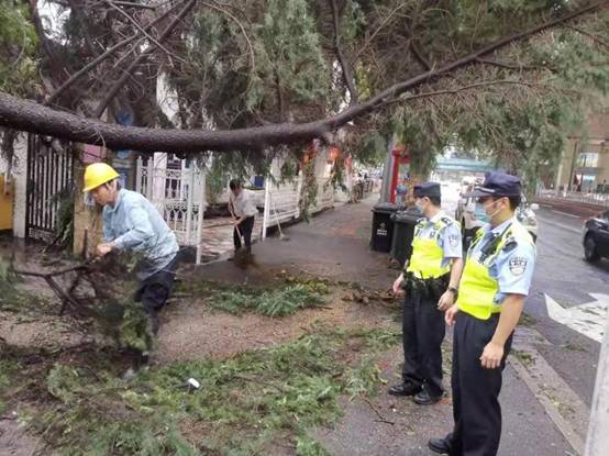 江蘇路派出所民警徐衛東、徐超在巡邏途中發現樹木因臺風天倒臥影響居民出行,現場疏導交通,聯系街道綠化養護單位到場清理,保障居民上班通勤。