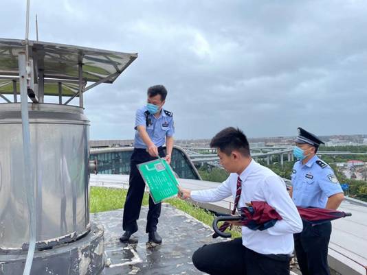 臨空經濟園區治安派出所綜合指揮室副主任周陽,民警邱曉春,指導園區物業,對商務樓宇屋頂設施設備進行檢查加固。