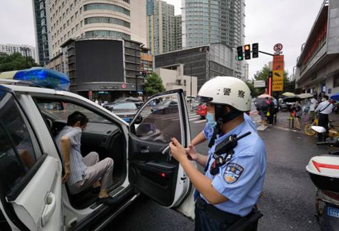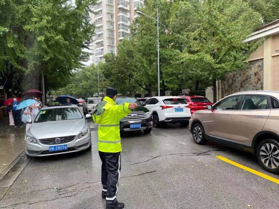 周家橋派出所民警衣嘯彧在天山中學開展臺風天護校和校園周邊交通指揮工作