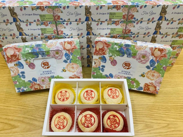 記者在新華路街道綜合為老服務中心看到,剛剛制作好的月餅已經被打包好,放入了精致的包裝禮盒中。禮盒外觀頗具巧思——不僅有象征中秋節的小兔子,還印上了新華路街道的珍貴歷史文化記憶——“法華牡丹”。