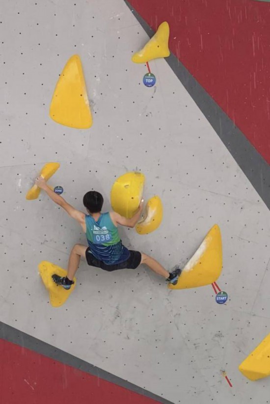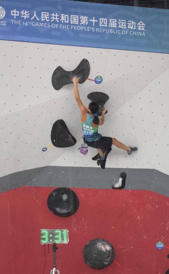下雨天,潮濕的巖壁給攀登增加了難度。朱馨文并不著急出手,她總是習慣性地在巖壁前思索一番,隨后按照心中既定的路線,堅定地去執行。等裁判給出成績后,朱馨文總是鞠躬致意,再輕快地一路小跑下場。從這個小細節看得出,她是一個非常認真、注重禮儀的孩子,也讓她跟別的選手有些不同。
