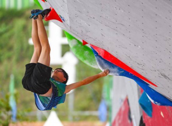 上午舉行的攀石難度賽,考驗著選手的腦力和體力。面對巖壁上的巖點,如同一道待解的數學題,需要正確解讀,并規劃最合理快速的路線,最后手腳并用真正去實現。