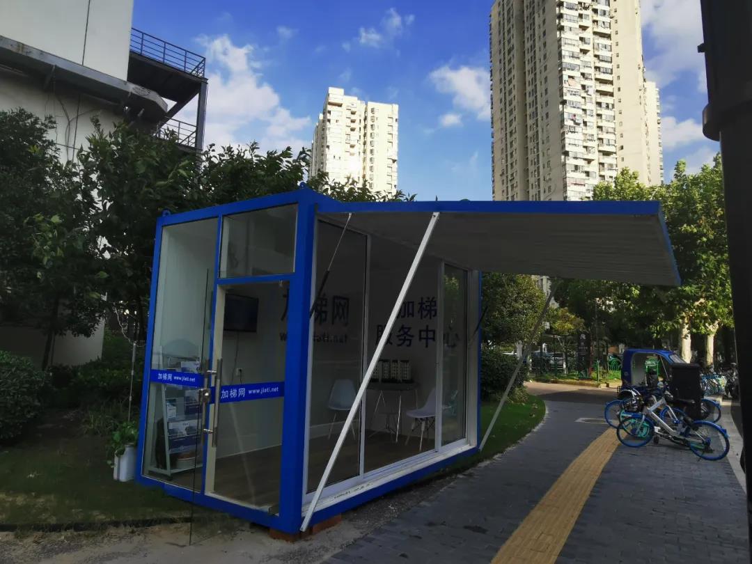 記者在臨青路上看到了其真容:一個長4米、寬2米、高2.8米的藍色盒子,占地面積約一個車位大小,內設電子屏幕,有加梯專業人員現場解答問題。