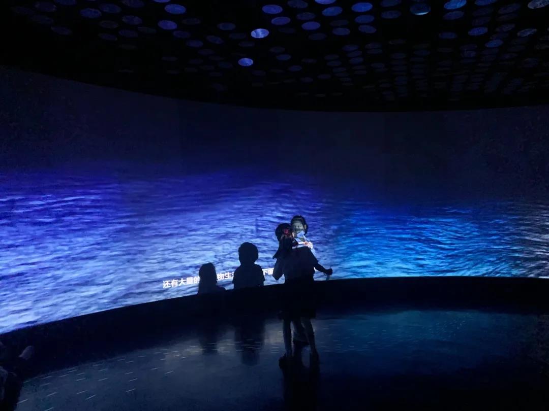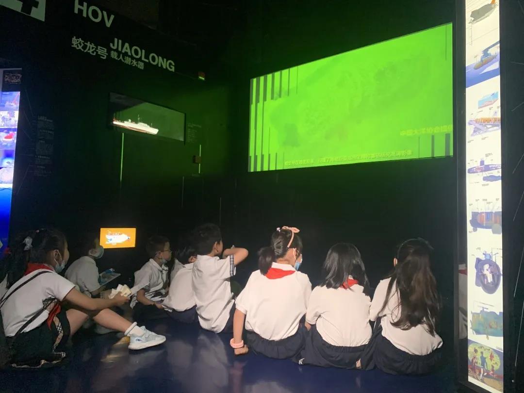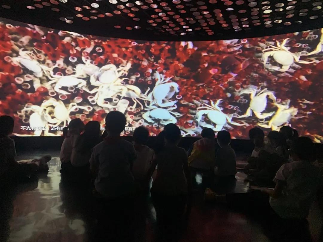 昏暗燈光下,大家在巨型環幕前排排坐,聚精會神地觀看深海宣傳片;玻璃展柜中,臉盆大的石蟹標本、小小的蛟龍號模型,無一不讓孩子們發出驚嘆……一邊欣賞影片,一邊參觀標本,仿佛自己就置身于海底,不同生物在身邊穿梭。